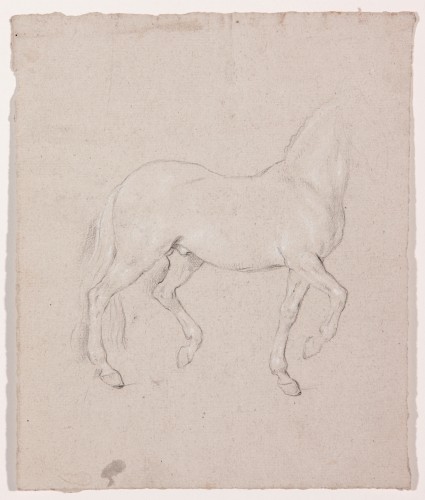 The second sheet, also in black chalk with touches of lead white, is a preparatory study for the plate Slow Trot. Portrait of Fernando, Prince of Asturias, engraved by Joaquín Ballester in 1797. In contrast to the first sheet, Carnicero has here focused on the horse’s body, carefully creating the light and shade with black chalk and lead white but only lightly sketching in the head with a few lines of graphite. There is a preparatory drawing for this print in the Calcografía Nacional that represents the final state prior to engraving. It includes the architectural setting of the scene and the two figures that accompany the Prince, one of whom is Benito de Aguirre, Master of the Horse.