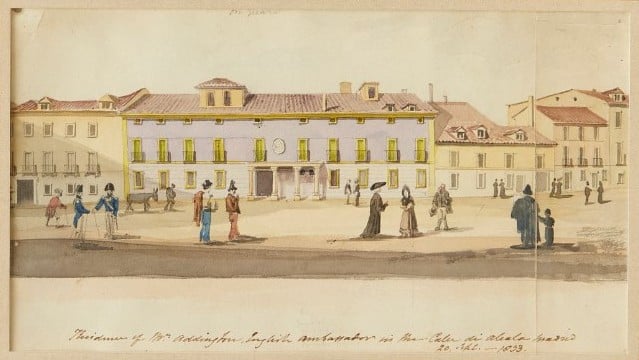 The choice of this residence was not accidental. Calle de Alcalá, an urban axis that linked the administrative heart of Madrid with the expanding city to the east, offered close proximity to the Royal Palace, the Ministry of State, and other influential political and diplomatic actors. The building, likely adapted for official and social functions, housed prominent figures such as Sir Henry Wellesley, brother of the Duke of Wellington, and later George Villiers, 4th Earl of Clarendon, who played a crucial role in Anglo-Spanish relations during the First Carlist War.